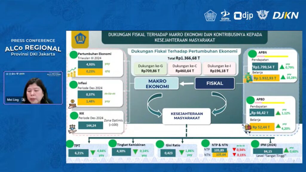 TRIASINDONESIA.COM – Hingga akhir tahun anggaran 2024 kinerja perekonomian DKI Jakarta tetap kuat. Inflasi tetap terkendali dalam rentang target sasaran, mencerminkan stabilitas ekonomi yang terjaga, diiringi optimisme konsumen yang terus berada di zona optimis. Pendapatan dan belanja pada APBN maupun APBD DKI Jakarta tercatat tumbuh optimis, memberikan sinyal positif bagi perekonomian DKI Jakarta. Hal ini disampaikan oleh Kepala Kanwil DJPb Provinsi DKI Jakarta, Mei Ling, dalam Press Conference ALCo Regional DKI Jakarta Edisi Januari 2025 yang digelar secara online.